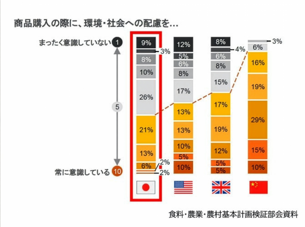 残念なことに日本は社会課題に対する若い人の関心が極めて低い国だと言われてきた。2023年に行われた食料・農業・農村基本法改定の議論では、環境やサステナブルに係る消費者の意識と行動が、アメリカやEU、中国など他に比べて極めて低いことが紹介された。世界中から食料が輸入され、いつでもどこでも欲しいものが手に入る日本ではそうした意識が薄かったことは仕方の無いことかもしれない。